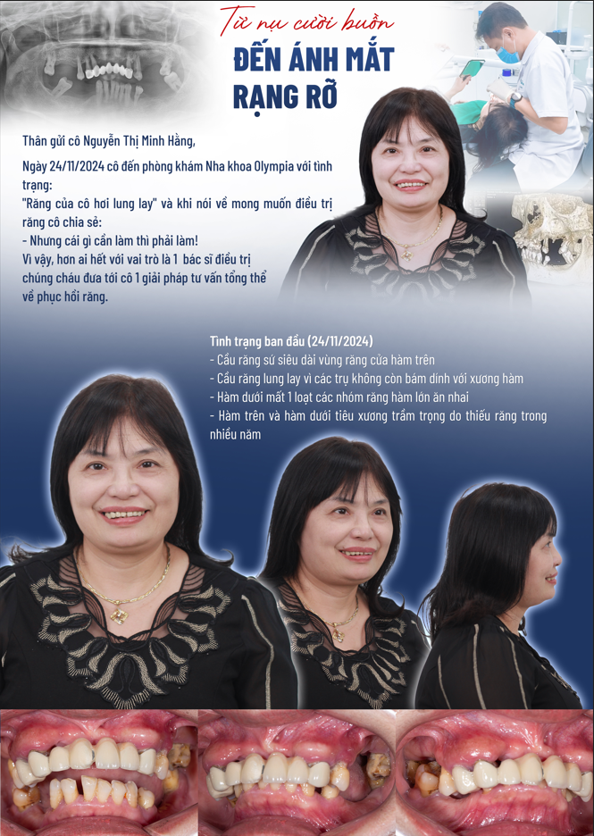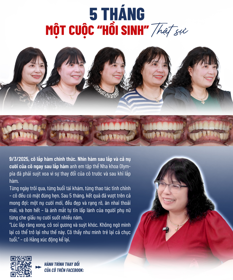 Nhưng rồi, bước ngoặt đến khi cô gặp đội ngũ Nha khoa Olympia. Sau buổi tư vấn chuyên sâu đầu tiên với ThS.BS Phạm Hùng Sơn, cô quyết định “làm lại từ đầu”. Không phải vì chạy theo vẻ ngoài, mà bởi vì cô muốn một chất lượng sống đúng nghĩa – được ăn ngon, cười thoải mái, và không còn lo lắng về những chiếc răng đang lung lay từng ngày.