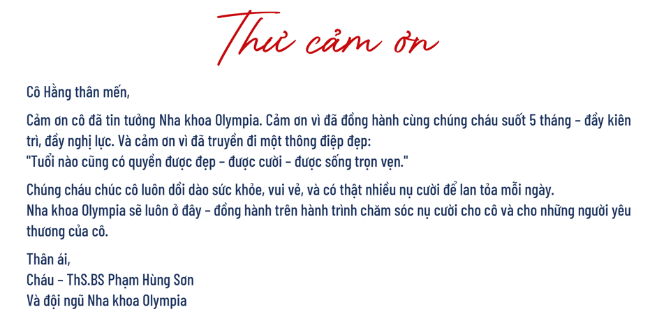 Thay mặt toàn thể đội ngũ Nha khoa Olympia, bác sĩ Sơn đã viết riêng một lá thư tay gửi đến cô Hằng – như một lời tri ân, một tấm lòng của những người được đồng hành cùng cô trong cuộc “lột xác” ngoạn mục này.